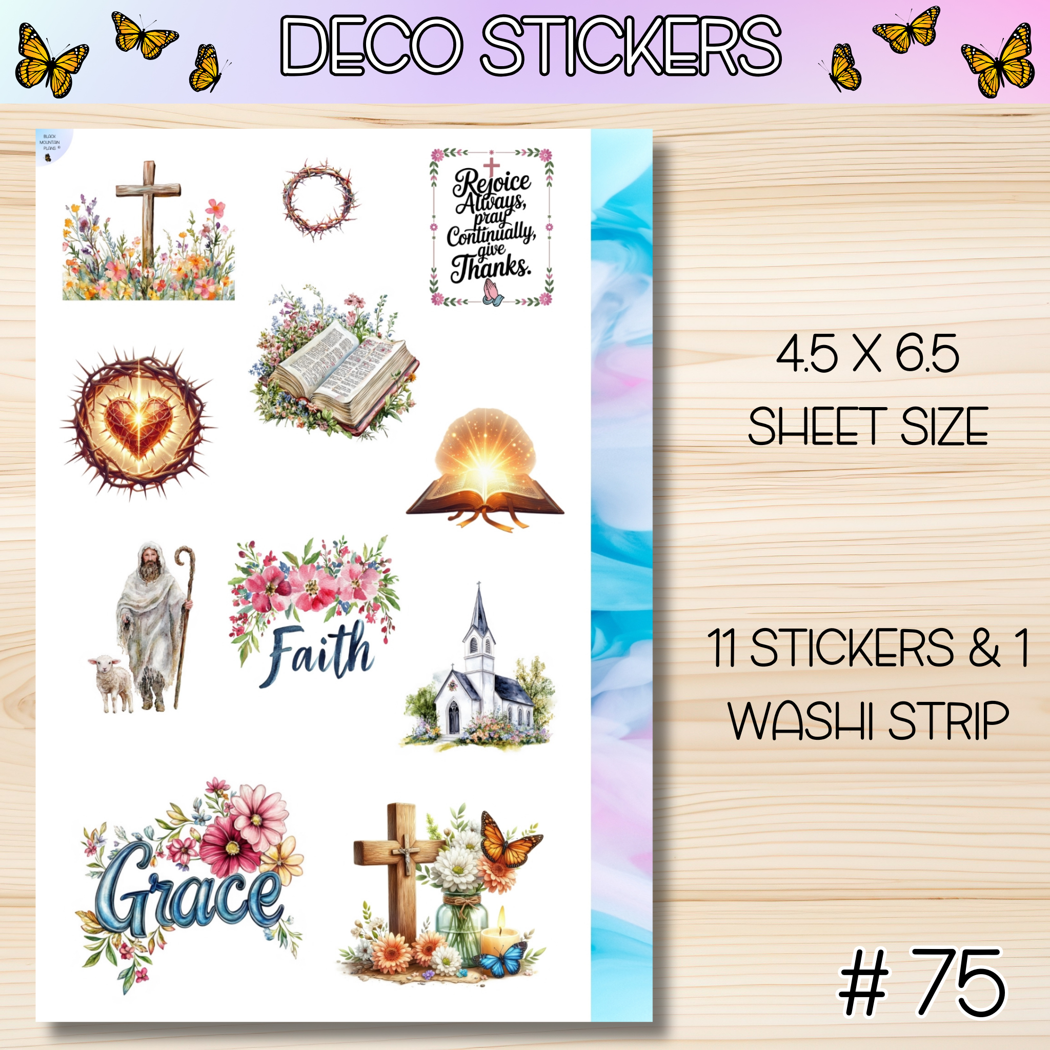 These deco stickers are perfect for adding to your daily pages, bible journaling or planner. Each sheet comes with deco and one coordinating washi strip. Each sheet size is sized at 4.5 x 6.5.